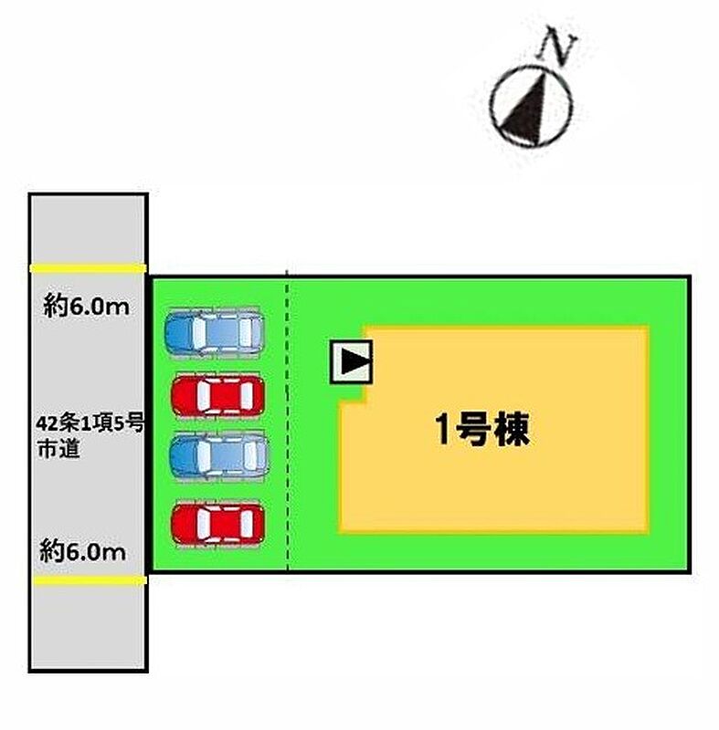 | 駐車場 | 4台 | 道路の幅員 | 1号棟:南西6m |