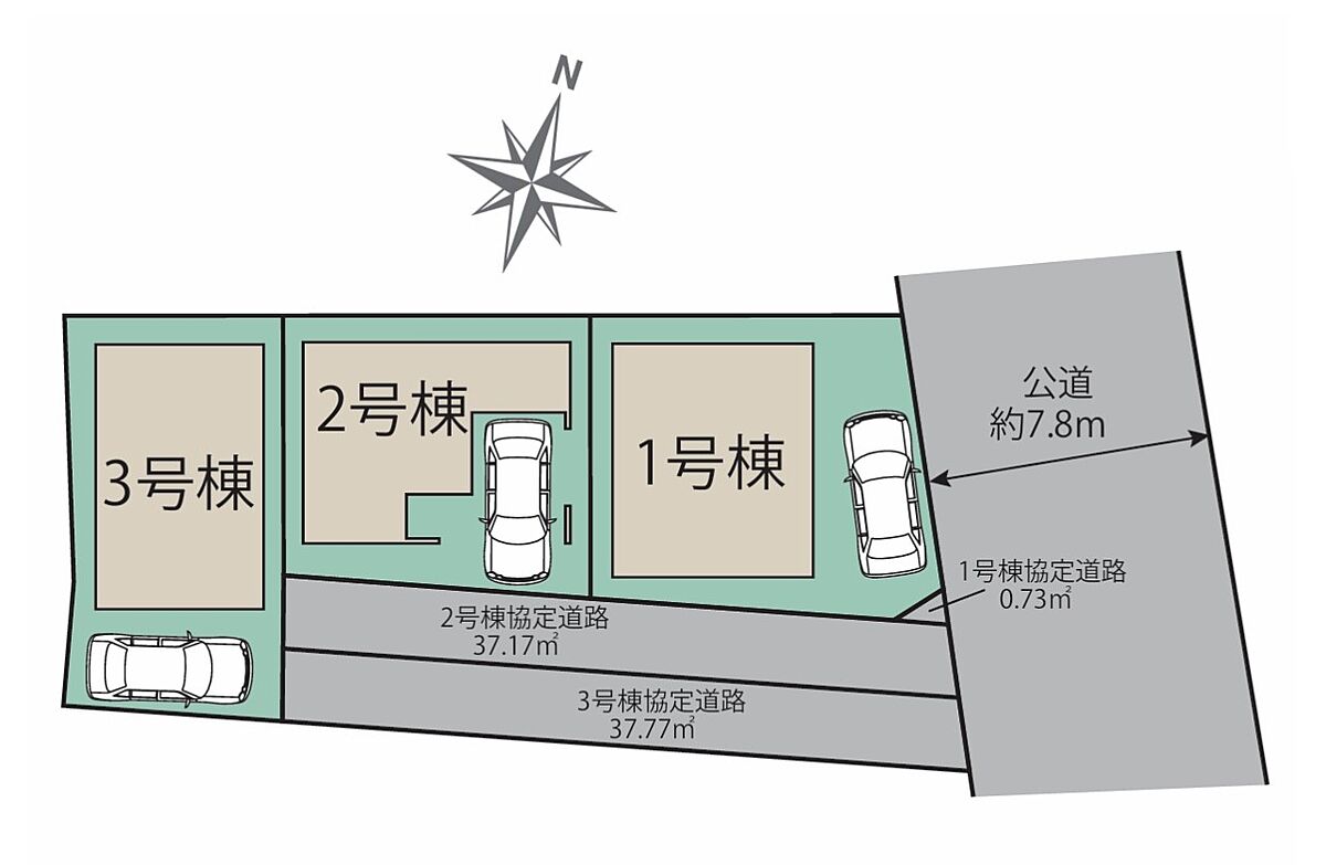 | 駐車場 | 1台 | 道路の幅員 | 1号棟:東7.8m /3号棟:東7.8m /2号棟:東7.8m |