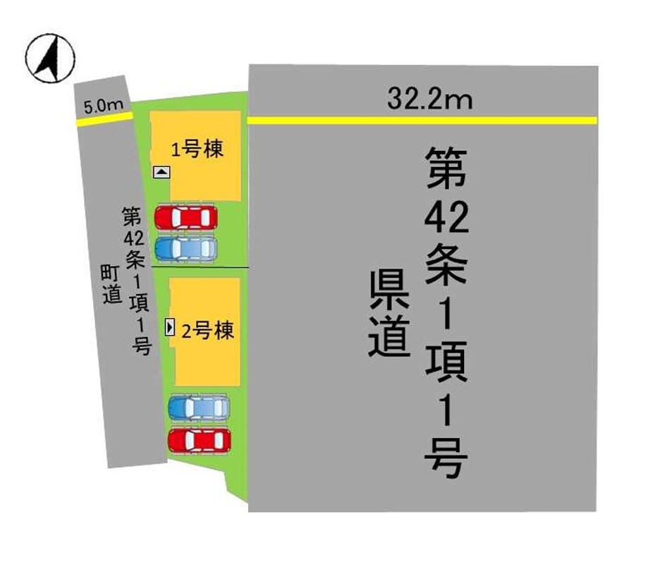 | 駐車場 | 2台 | 道路の幅員 | 1号棟:西5m 東32.2m /2号棟:西5m 東32.2m |