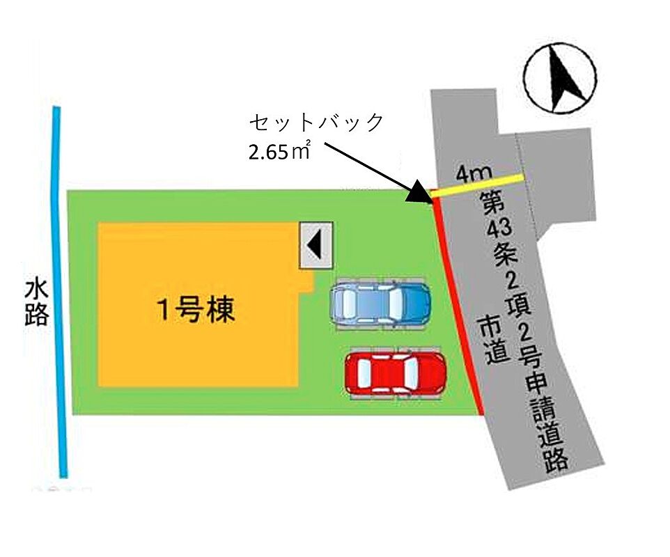 | 駐車場 | 2台 | 道路の幅員 | 1号棟:東4m |