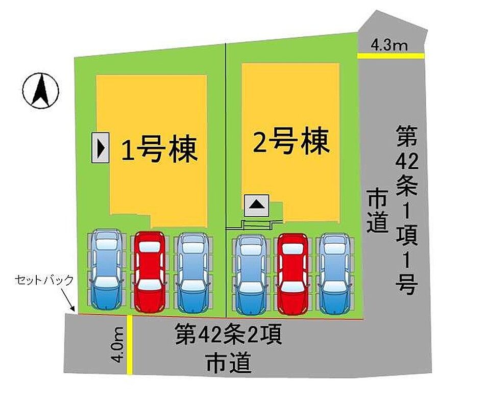 | 駐車場 | 3台 | 道路の幅員 | 1号棟:南4m /2号棟:南4m 東4.3m |