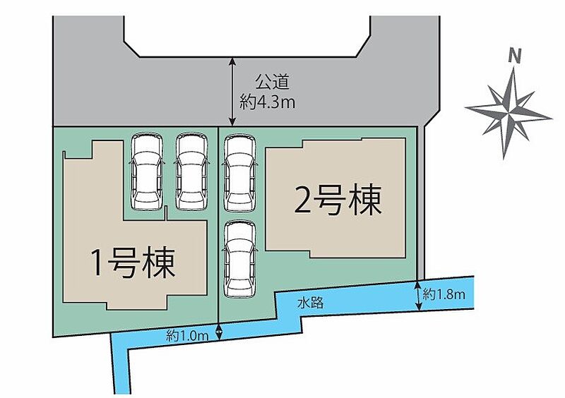 | 駐車場 | 2台 | 道路の幅員 | 1号棟:北4.3m |