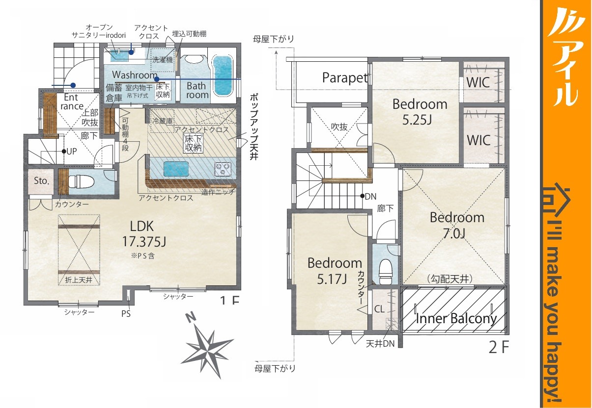 ■アイルは安心の創業39年! 定休日なし 毎日現地見学可能 店舗はリクルート天神ビル4Fです ■現地案内随時受付中 当日のご内覧も可能です!お仕事帰りのお時間でも事前にご相談頂ければ調整いたします。 ・さくっとコース・・・忙しいお客さまでもさくっとご見学可能です。 ・ゆっくりコース・・・細かい設備等もゆっくりとご説明させていただきます。 ・じっくりコース・・・分譲地+周辺環境なども一緒にご紹介可能です。 その他お客さまのご予定に合わせてご内覧いただけます。 ■お子様連れでのご内覧・ご来店も大歓迎! お子様向けのお菓子等ご用意しております。お気軽にお申し付けくださいませ。 ■ご案内方法 ◎お客さまのご指定時間帯に、現地物件でのお待ち合わせ ◎担当スタッフによる送迎 ・ご自宅 ・最寄駅 ・物件近くの目印施設 etc… その他ご希望のお迎え場所等ございましたらお気軽にご相談下さい。 ◎弊社にご来店される場合 福岡市中央区舞鶴1-1-3 リクルート天神ビル4F ※お車でお越しの場合、駐車場料金は弊社が負担いたしますのでご安心ください 『接道』角地 南西5.2m公道 北西6m公道 設備:都市ガス 公営水道 下水 防犯シャッター 吹き抜け 設計住宅性能評価付 長期優良住宅 建設住宅性能評価書(新築時) BELS/省エネ基準適合認定書あり 駐車場2台以上 閑静な住宅地 平坦地 角地 地盤調査済 前道6m以上 周辺交通量少なめ スーパーが近い(10分以内) 小学校徒歩10分以内 保育施設・幼稚園5分以内 公園5分以内 コンビニ5分以内 システムキッチン ガス3口 カウンタキッチン 対面キッチン 食器洗い機付き 浄水器 追い焚き 浴室乾燥機 ウォシュレット オートバス付き 脱衣所 トイレ2ヶ所 浴室1坪以上 浴室に窓 浴室暖房 バルコニー 2階建 LDK15畳以上 採光3面 全室2面採光 全室フローリング スマートキー クローゼット ウォークインクローゼット 収納 床下収納 下駄箱 全居室収納 シャンプドレッサー付き フラット35Sに対応 モニタ付きインターフォン 複層ガラス 火災警報器(報知機) 通風良好 陽当り良好 24時間換気システム |
