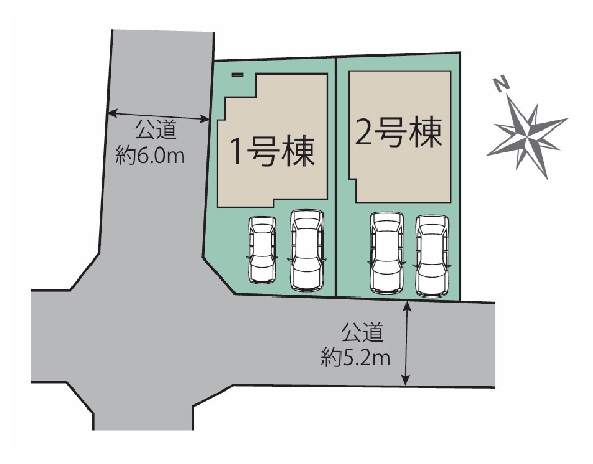 | 駐車場 | 2台 | 道路の幅員 | 2号棟:南西5.2m /1号棟:南西5.2m 北西6m |