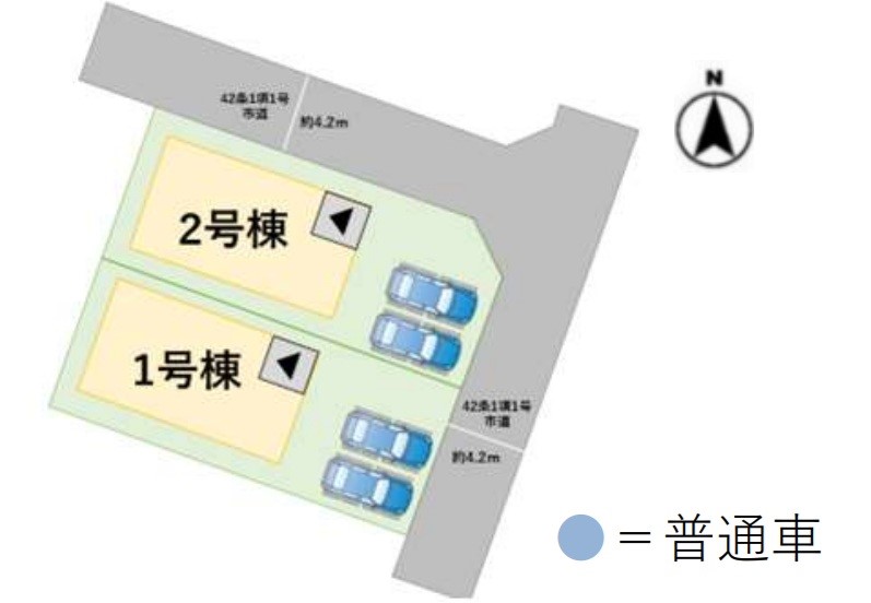 | 駐車場 | 2台 | 道路の幅員 | 1号棟:東4.2m /2号棟:東4.2m 北4.2m |