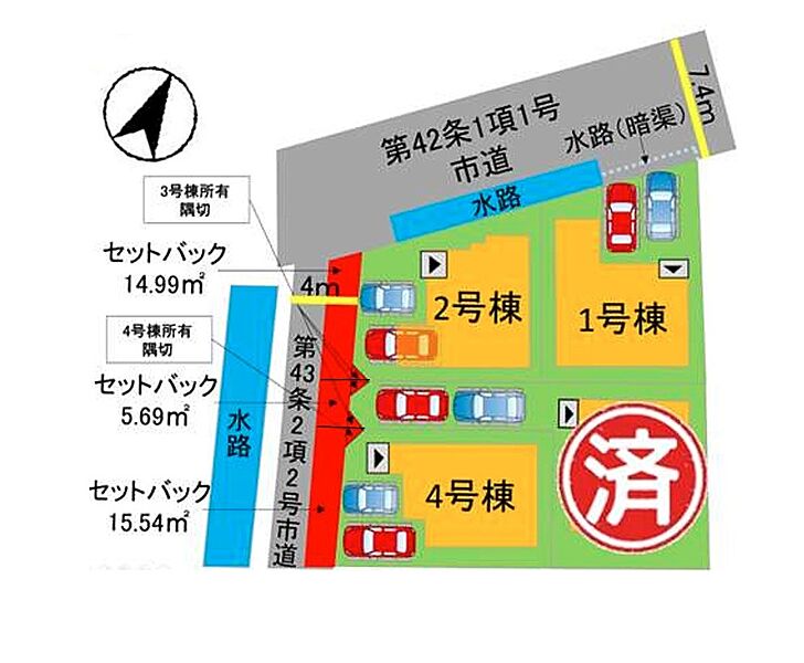 | 駐車場 | 2台 | 道路の幅員 | 4号棟:南西4m /2号棟:北西7.4m 南西4m /1号棟:北西7.4m |