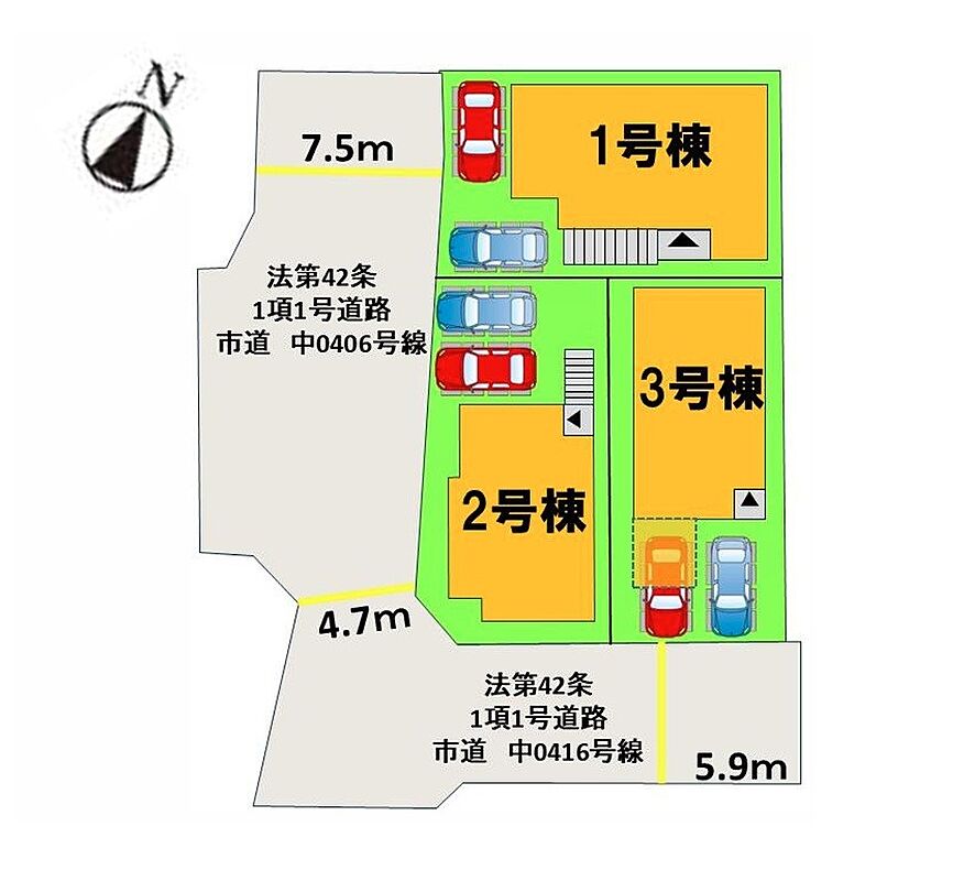 | 駐車場 | 2台 | 道路の幅員 | 1号棟:西7.5m /3号棟:南5.9m /2号棟:西7.5m 南5.9m |