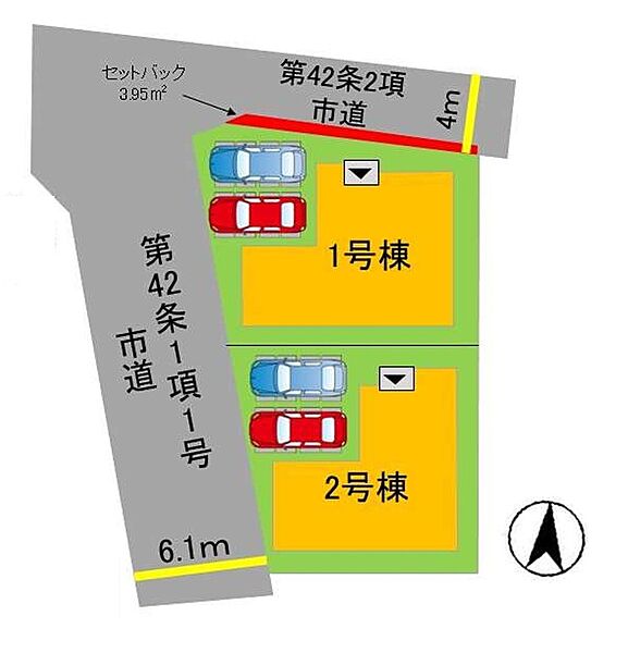 | 駐車場 | 2台 | 道路の幅員 | 1号棟:西6.1m 北4m /2号棟:西6.1m |