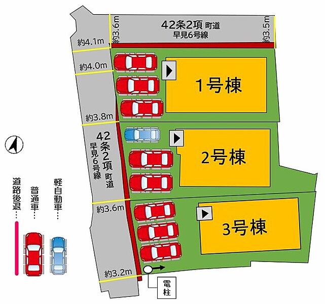 | 駐車場 | 3台 | 道路の幅員 | 3号棟:西4m /1号棟:西4m 北3.6m /2号棟:西4m |