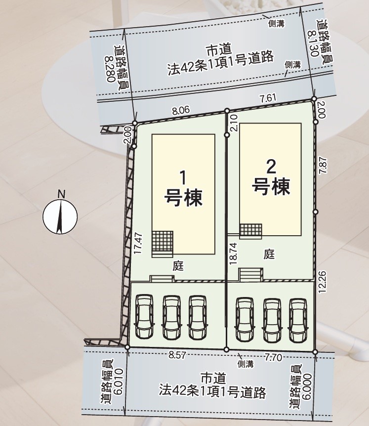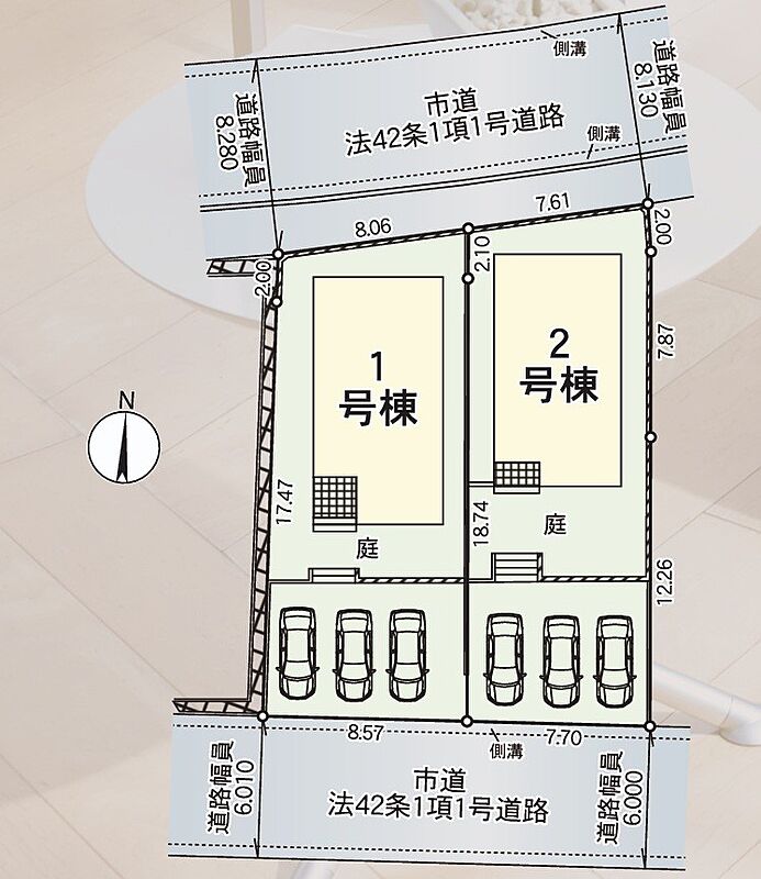 | 駐車場 | 3台 | 道路の幅員 | 2号棟:南6m 北8.1m /1号棟:南6m 北8.1m |