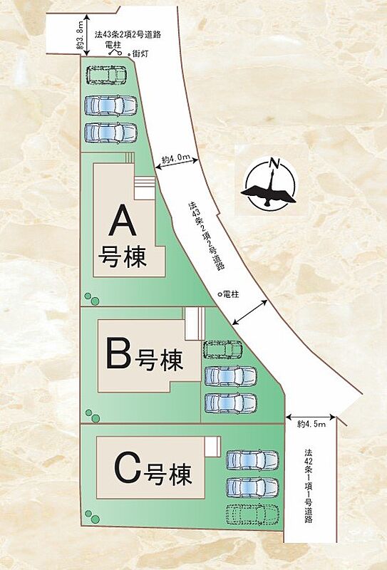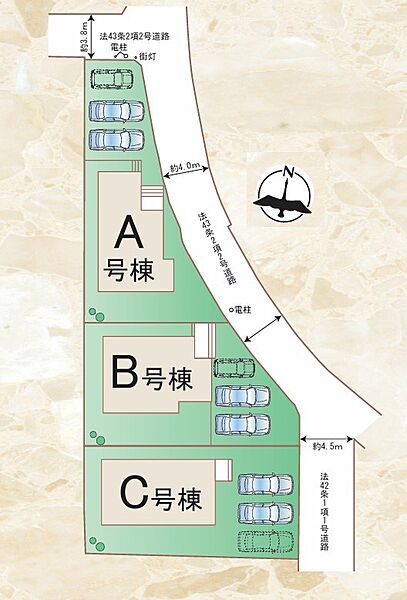 | 駐車場 | 3台 | 道路の幅員 | C号棟:北東3.9m /A号棟:北東3.9m 北西3.6m /B号棟:北東3.9m |