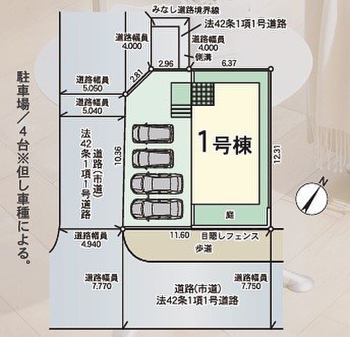 | 駐車場 | 4台 | 道路の幅員 | 1号棟:南東7.7m 南西5m 北西4m |