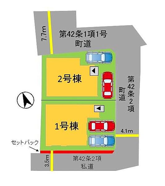 | 駐車場 | 2台 | 道路の幅員 | 2号棟:東4.1m 北7.7m /1号棟:東4.1m 南3.5m |