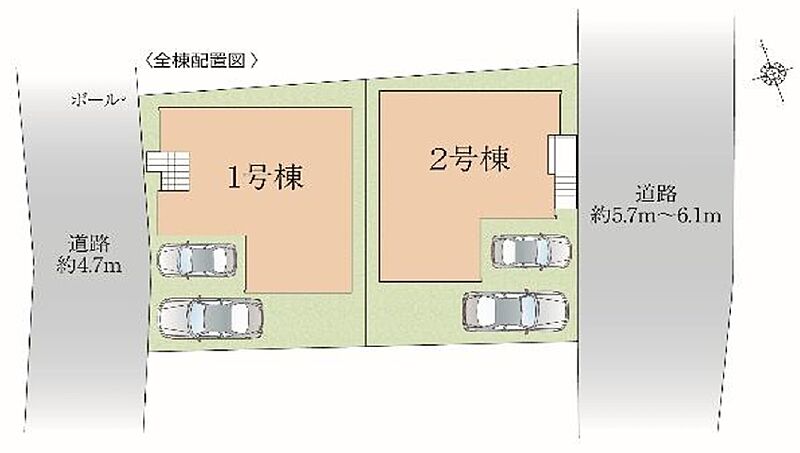 | 駐車場 | 2台 | 道路の幅員 | 1号棟:西4.7m /2号棟:東5.7m |