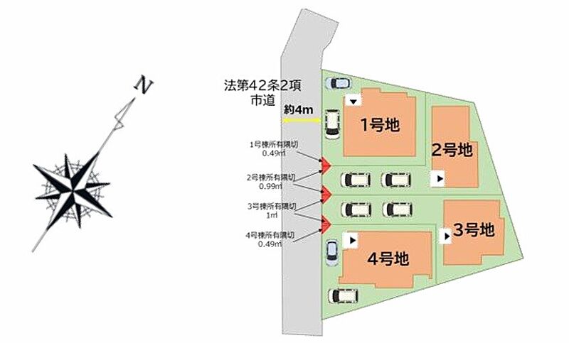 | 駐車場 | 2台 | 道路の幅員 | 4号棟:南西4m /3号棟:南西4m /2号棟:南西4m |