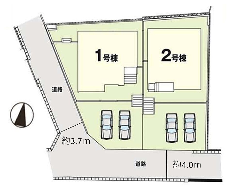 | 駐車場 | 2台 | 道路の幅員 | 2号棟:南4m /1号棟:南4m 西3.7m |