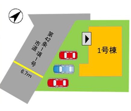 | 駐車場 | 3台 | 道路の幅員 | 1号棟:南西6.7m 北西8.3m |