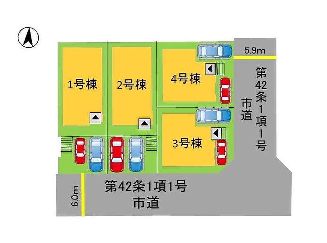 | 駐車場 | 2台 | 道路の幅員 | 2号棟:南6m /3号棟:南6m 東5.9m |