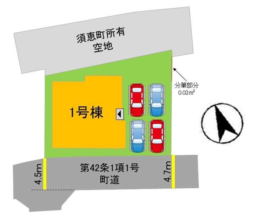 | 駐車場 | 4台 | 道路の幅員 | 1号棟:南西4.5m |