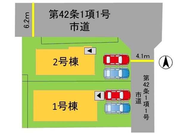 | 駐車場 | 2台 | 道路の幅員 | 2号棟:東4.1m 北6.2m |