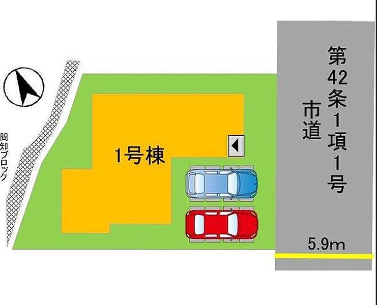 | 駐車場 | 2台 | 道路の幅員 | 1号棟:南東5.9m |