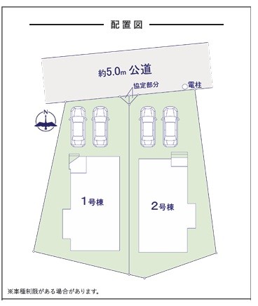 | 駐車場 | 2台 | 道路の幅員 | 1号棟:北5m /2号棟:北5m |