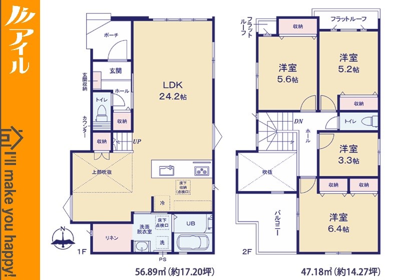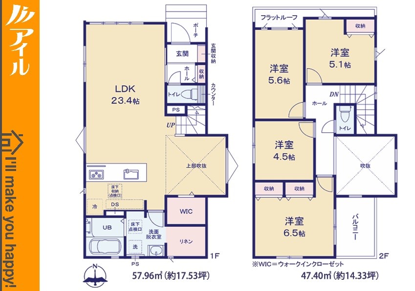 ◆充実の収納付!リネンスペース・WIC(2号棟) ◆駐車場もゆったりの並列2台分 ◆南面バルコニー付 2階に洋室を4部屋設置した4LDKの間取り