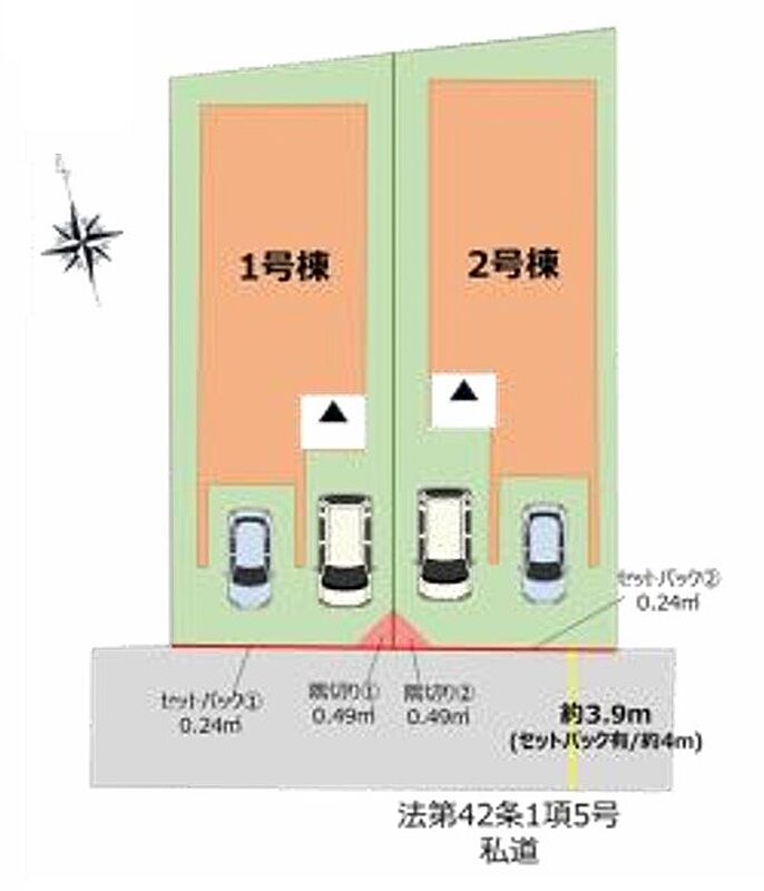 | 駐車場 | 2台 | 道路の幅員 | 1号棟:南3.9m /2号棟:南3.9m |