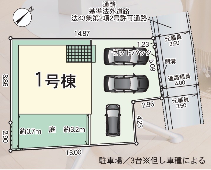 | 駐車場 | 3台 | 道路の幅員 | 1号棟:北東3m |