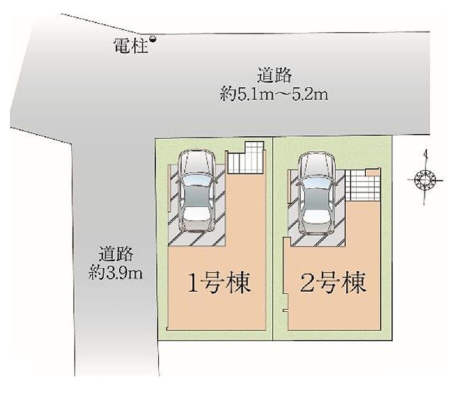| 駐車場 | 1台 | 道路の幅員 | 1号棟:北5.1m 西3.9m /2号棟:北5.1m |