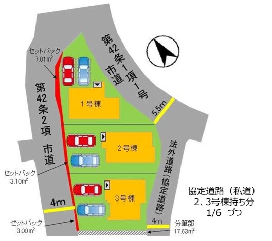 | 駐車場 | 2台 | 道路の幅員 | 1号棟:西4m 東5.5m /3号棟:南東4m 東5.5m /2号棟:西4m 東5.5m |