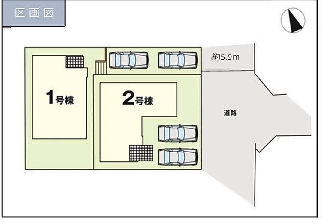 | 駐車場 | 2台 | 道路の幅員 | 1号棟:東5.9m /2号棟:東5.9m |