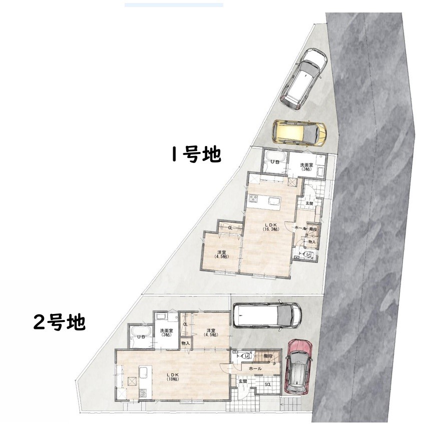 | 駐車場 | 2台 | 道路の幅員 | 1号地:南東4.7m /2号地:南東4.7m |