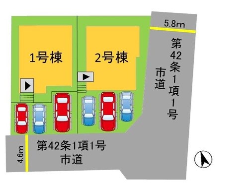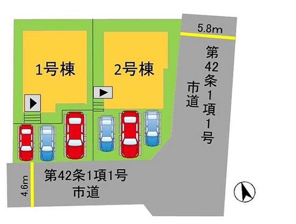 | 駐車場 | 3台 | 道路の幅員 | 1号棟:南西4.6m /2号棟:南西4.6m 南東5.8m |