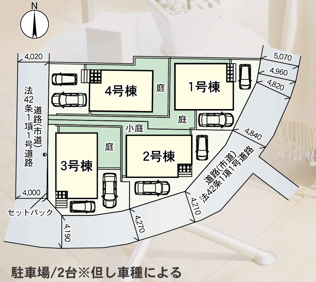 | 駐車場 | 2台 | 道路の幅員 | 3号棟:南4.1m 西4m /1号棟:東4.8m /2号棟:南東4.2m /4号棟:西4m |