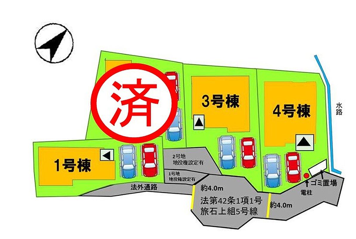 | 駐車場 | 2台 | 道路の幅員 | 4号棟:南東4m |