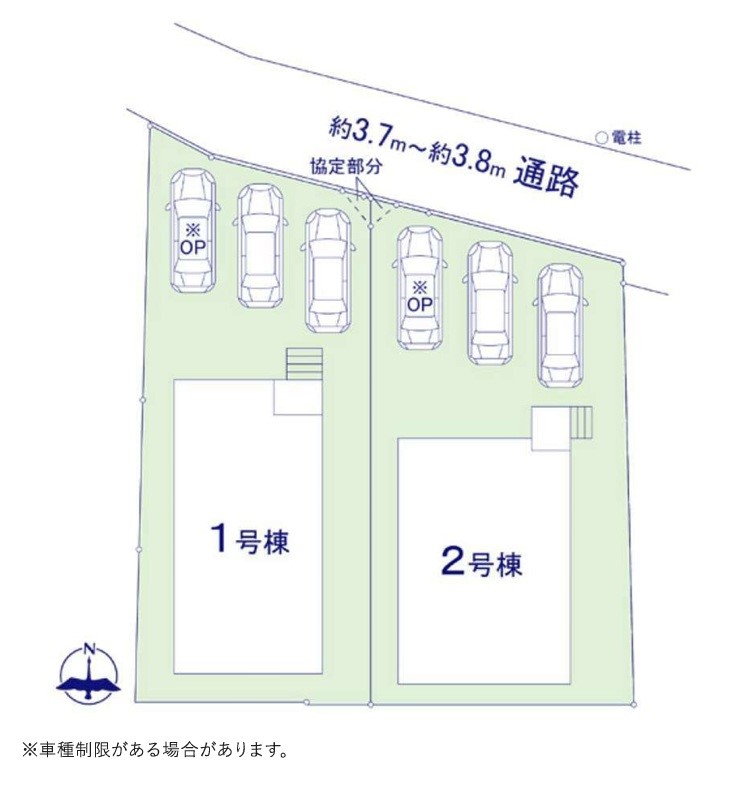 | 駐車場 | 3台 | 道路の幅員 | 2号棟:北3.7m /1号棟:北3.7m |