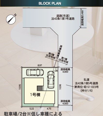 | 駐車場 | 2台 | 道路の幅員 | 1号棟:北東4m |