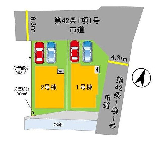 | 駐車場 | 2台 | 道路の幅員 | 1号棟:北6.3m 東4.3m /2号棟:北6.3m |