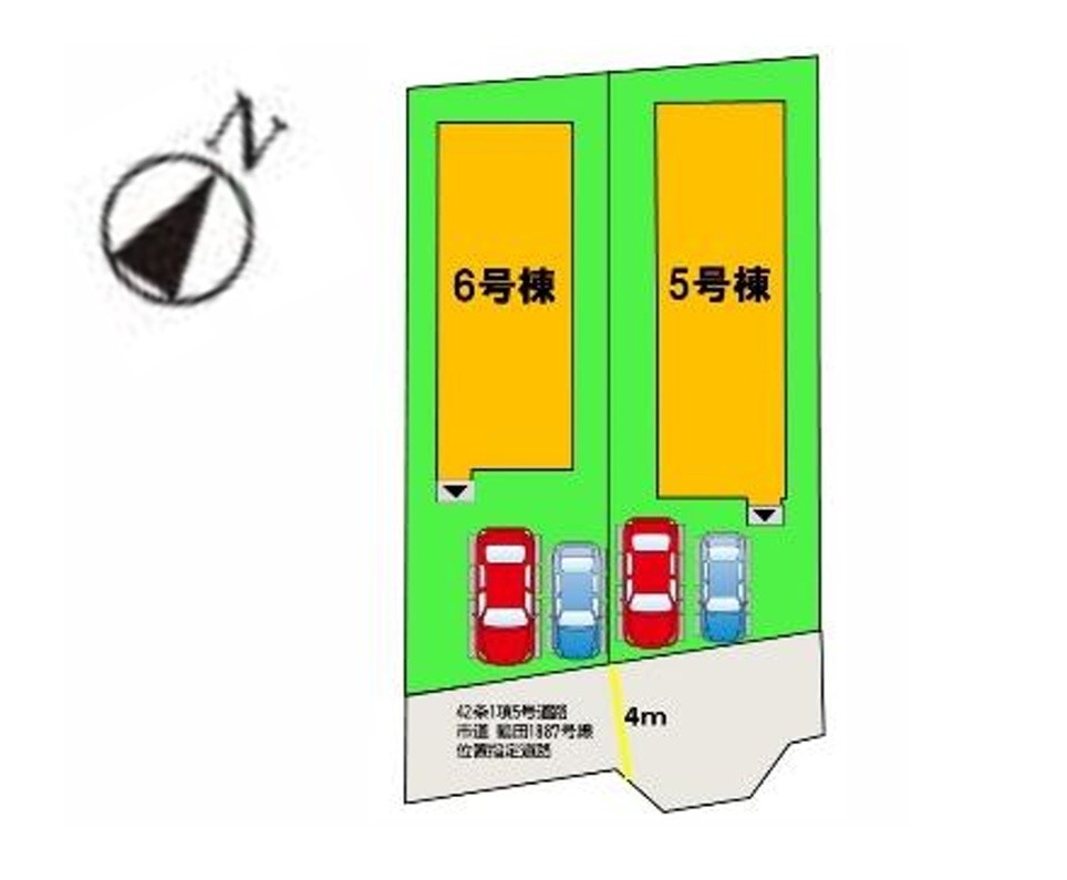 | 駐車場 | 2台 | 道路の幅員 | 5号棟:南東4m /6号棟:南東4m |
