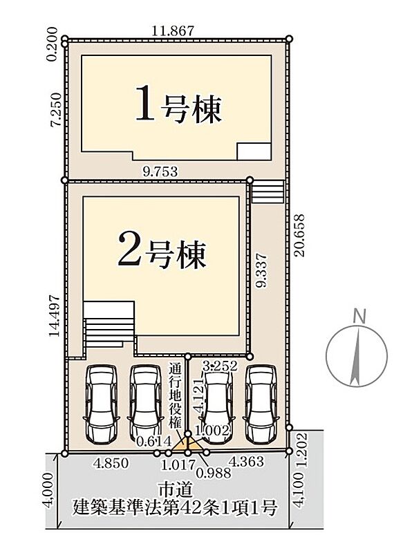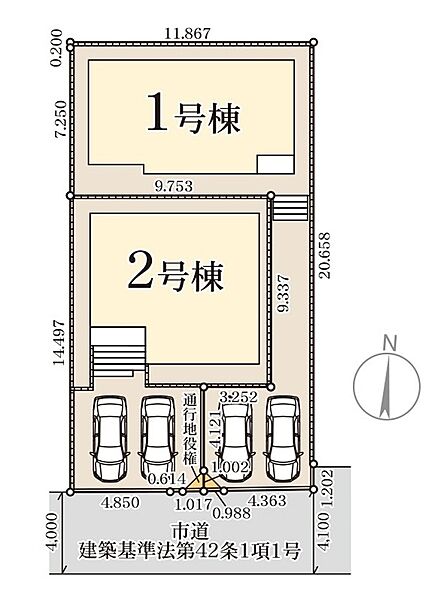 | 駐車場 | 2台 | 道路の幅員 | 2号棟:南4m /1号棟:南4m |