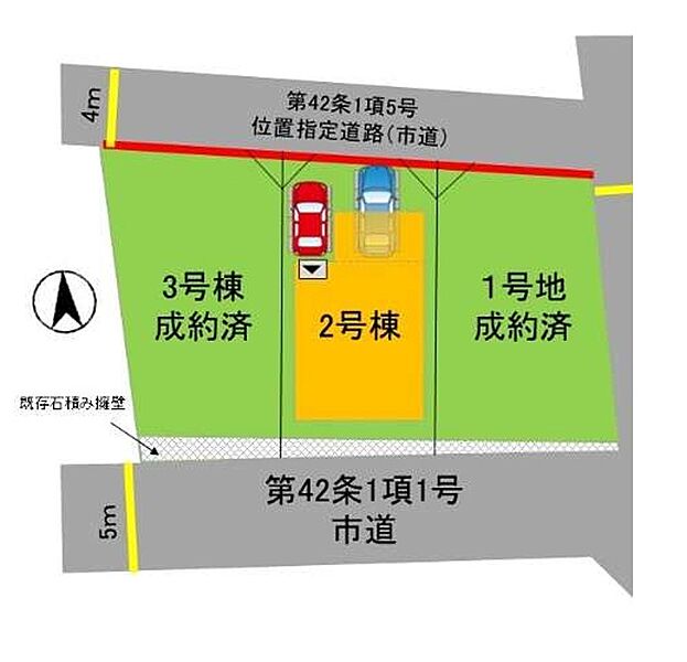 | 駐車場 | 2台 | 道路の幅員 | 2号棟:北5.3m 南5m |