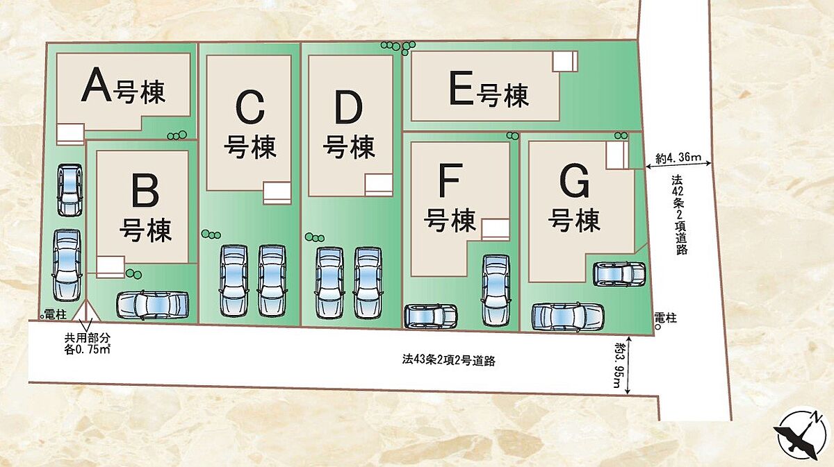 | 駐車場 | 1台 ~ 2台 | 道路の幅員 | G号棟:南3.9m 東4.3m /F号棟:南3.9m /C号棟:南3.9m /A号棟:南3.9m /B号棟:南3.9m |