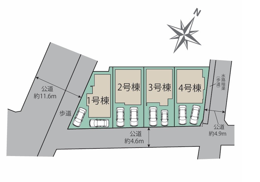 | 駐車場 | 2台 | 道路の幅員 | 2号棟:南東4.6m /4号棟:南東4.6m 北東4.9m /1号棟:南西11.6m 南東4.6m /3号棟:南東4.6m |