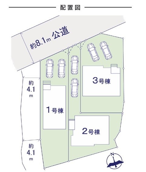 | 駐車場 | 2台 | 道路の幅員 | 1号棟:北8.1m /2号棟:北8.1m /3号棟:北8.1m |