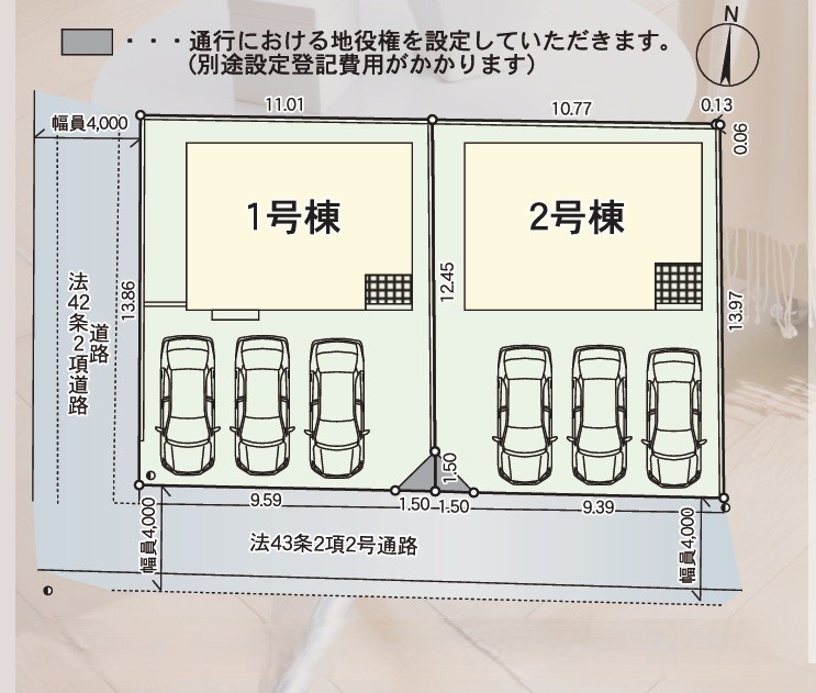 | 駐車場 | 3台 | 道路の幅員 | 1号棟:南4m 西4m /2号棟:南4m |