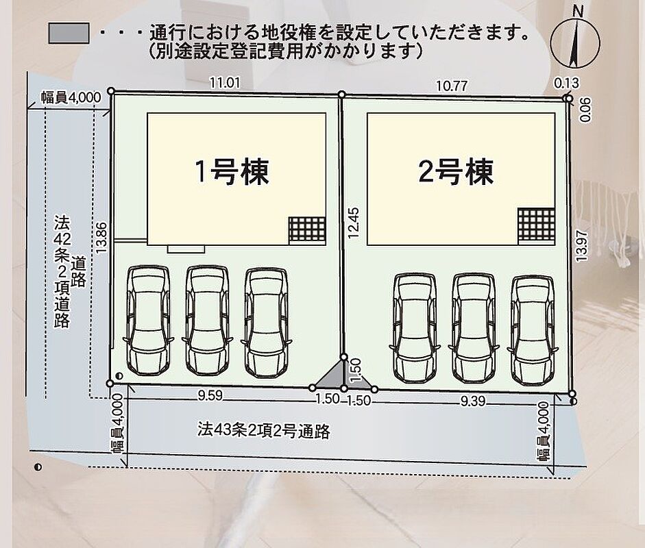 | 駐車場 | 3台 | 道路の幅員 | 1号棟:南4m 西4m |