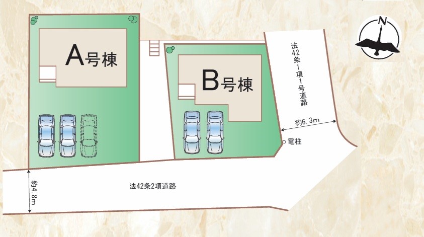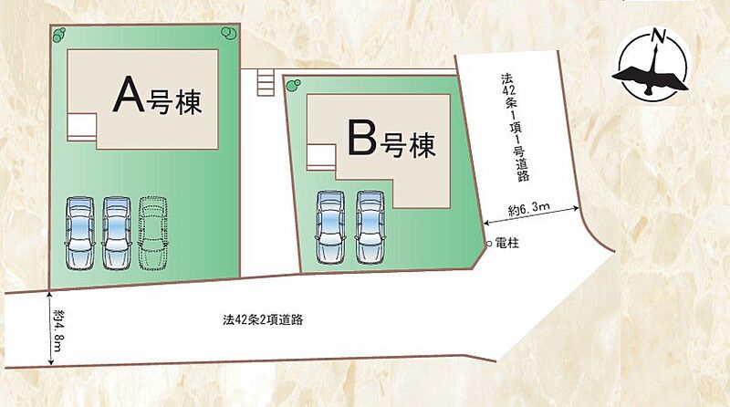 | 駐車場 | 2台 ~ 3台 | 道路の幅員 | B号棟:南東4.8m 北東6.3m /A号棟:南東4.8m |