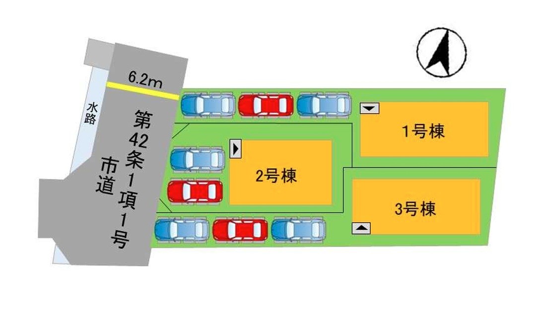 | 駐車場 | 3台 | 道路の幅員 | 3号棟:西6.2m /1号棟:西6.2m /2号棟:西6.2m |
