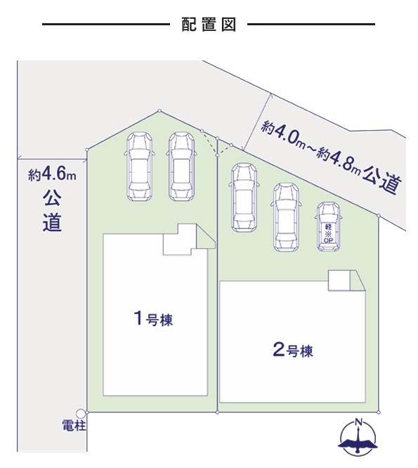 | 駐車場 | 2台 | 道路の幅員 | 2号棟:北東4m /1号棟:北東4m 西4.6m |